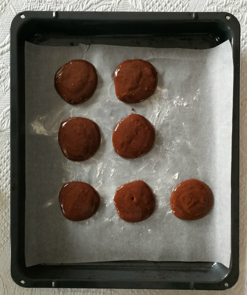 - Otrzymaną masę wykładamy na papier do pieczenia lekko podsypany mąką (należy zachować duże odstępy między ciastkami, aby uniknąć ich złączenia w czasie pieczenia)