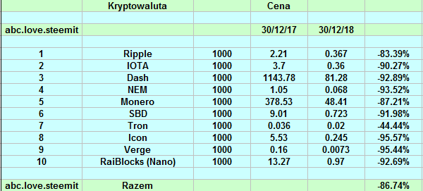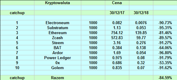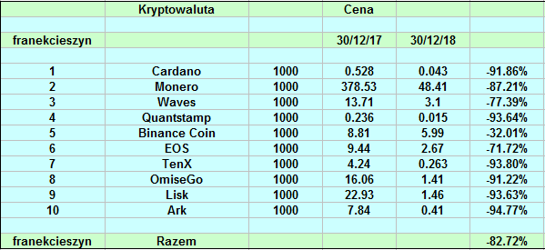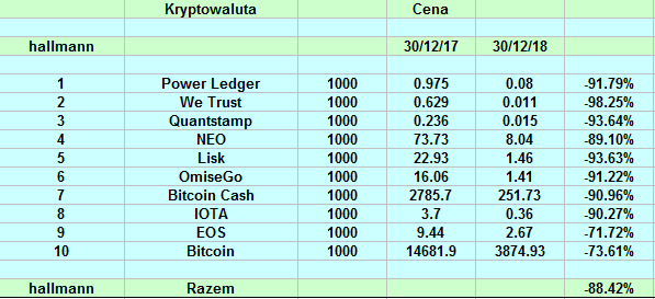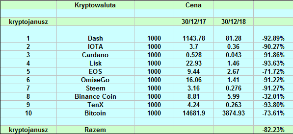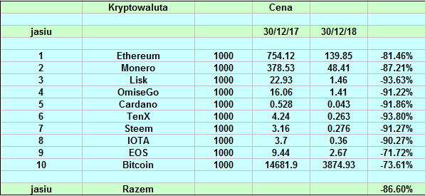 Wyniki naszych portfolio są bardzo zbliżone. Ceny większości altów straciły ok. 90%. Nielicznymi wyjątkami są: Binance (-32%), EOS (-71%), 0x (-53%), BAT (-64%), ETH (-81%), TRX (-44%), XRP (-83%). Bitcoin "spadł" o 73% w tym roku.