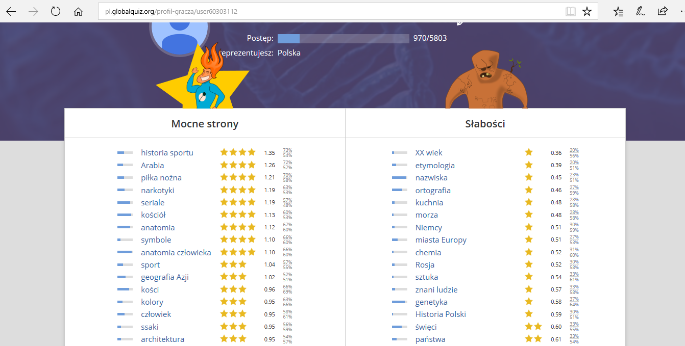 Również możemy wejść na nasz profil jeśli zarejestrujemy się lub zalogujemy poprzez facebooka oraz google +. W zakładce profil możemy sprawdzić nasze mocne oraz słabe stronę w wykazie procentowym na przestrzeni wszystkich pytań które mieliśmy. Przedstawię wam to na podstawie mojego profilu jak to wygląda.