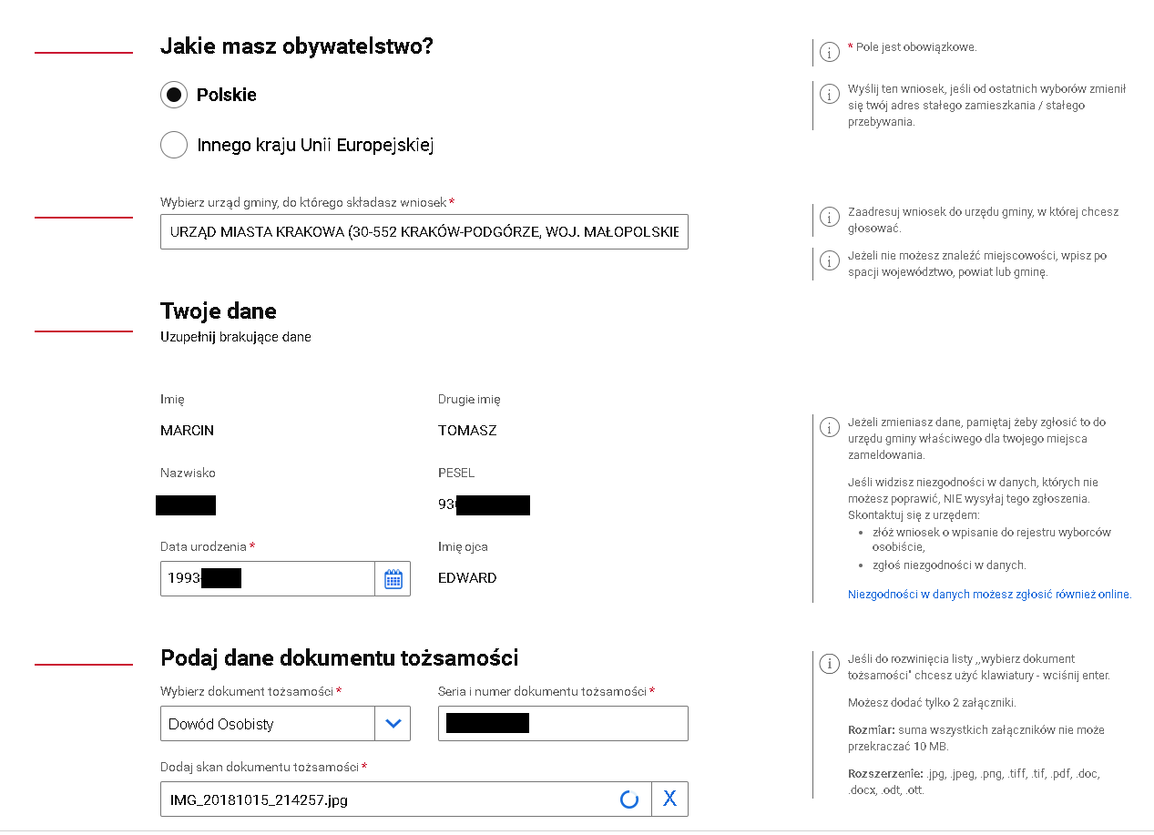 Pozostaje więc dopisanie do rejestru wyborców poza miejscem zameldowania. W praktyce metoda ta powinna być stosowana tylko w przypadku, kiedy faktycznie mieszkamy w innej miejscowości niż jesteśmy zameldowani. Musimy złożyć odpowiedni wniosek do urzędu gminy, w której mieszkamy. Jako że ten wpis czytają raczej tylko osoby, które posiadają i potrafią korzystać z Internetu postanowiłem przedstawić poradnik jak złożyć takowy wniosek przez Internet. W ogóle polecam raczej załatwiać większość spraw (od składania PITu zaczynając), które możemy w ten sposób załatwić właśnie za pośrednictwem tego medium. Nie tylko możemy zrobić to o dowolnej odpowiadającej nam godzinie (bez potrzeby wcześniejszego urywania się z pracy, aby skoczyć do urzędu), jest to metoda szybsza, wygodniejsza i nie wymagająca stania w kolejce lub znoszenia złego dnia urzędnika 😉.