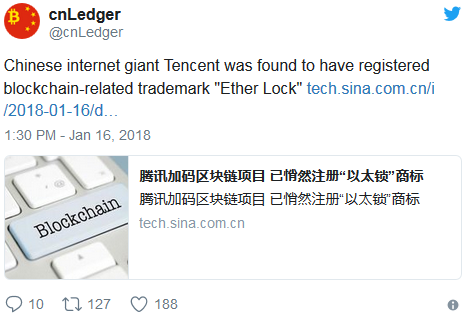 W dalszym rozwoju, ten chiński konglomerat Tencent zarejestrował "znak towarowy związany z Blockchain" dla podmiotu określanego różnie jako "Blokada Eteru" i "Blokada Ethernetu".