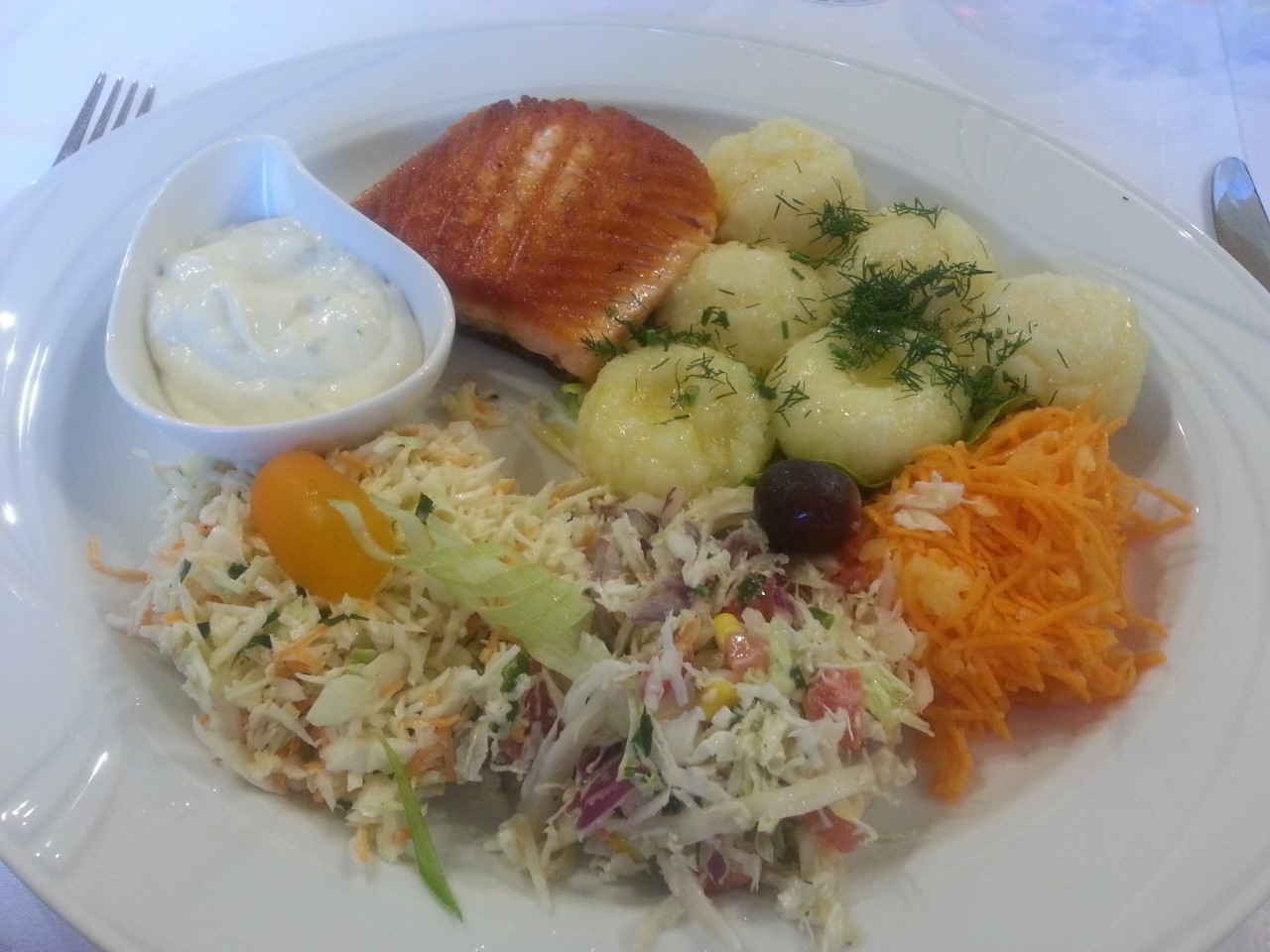 Rybą łososiem z kluseczkami sląskimi i suróweczkami