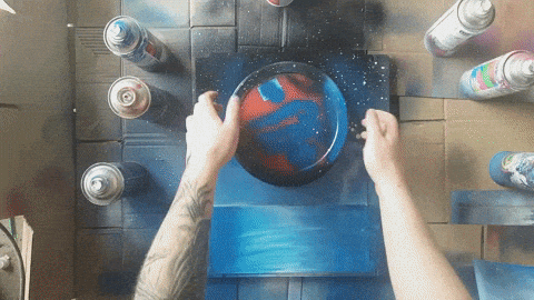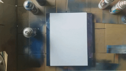Przykładamy nasz szablon planety do kartki. Po tym wykonujemy niebo, zaczynając od pomalowania góry czarnym sprayem, następnie ciemnym niebieskim i na koniec jasnym niebieskim na samym dole.