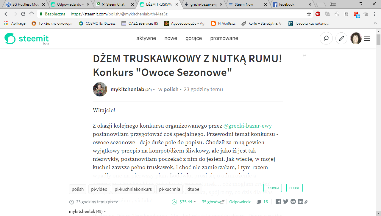 Z okazji kolejnego konkursu organizowanego przez @grecki-bazar-ewy postanowiłam przygotować coś specjalnego. Przewodni temat konkursu - owoce sezonowe - daje duże pole do popisu. Chodził za mną pewien wyjątkowy przepis na kompot/dżem śliwkowy, ale jako iż jest tak niezwykły, postanowiłam poczekać z nim do jesieni. Jak wiecie, w mojej kuchni zawsze pełno truskawek, i choć nie zamierzałam, i tym razem wpadły one na pierwszy plan. Lodówka prosi się o odmrożenie a zamrożone truskawki w związku z tym o ratunek... cóż mogłam zrobić! Jako, że w UK na truskawki sezon nadal trwa, spójrzmy, co dziś dla Was przygotowałam, sialala!