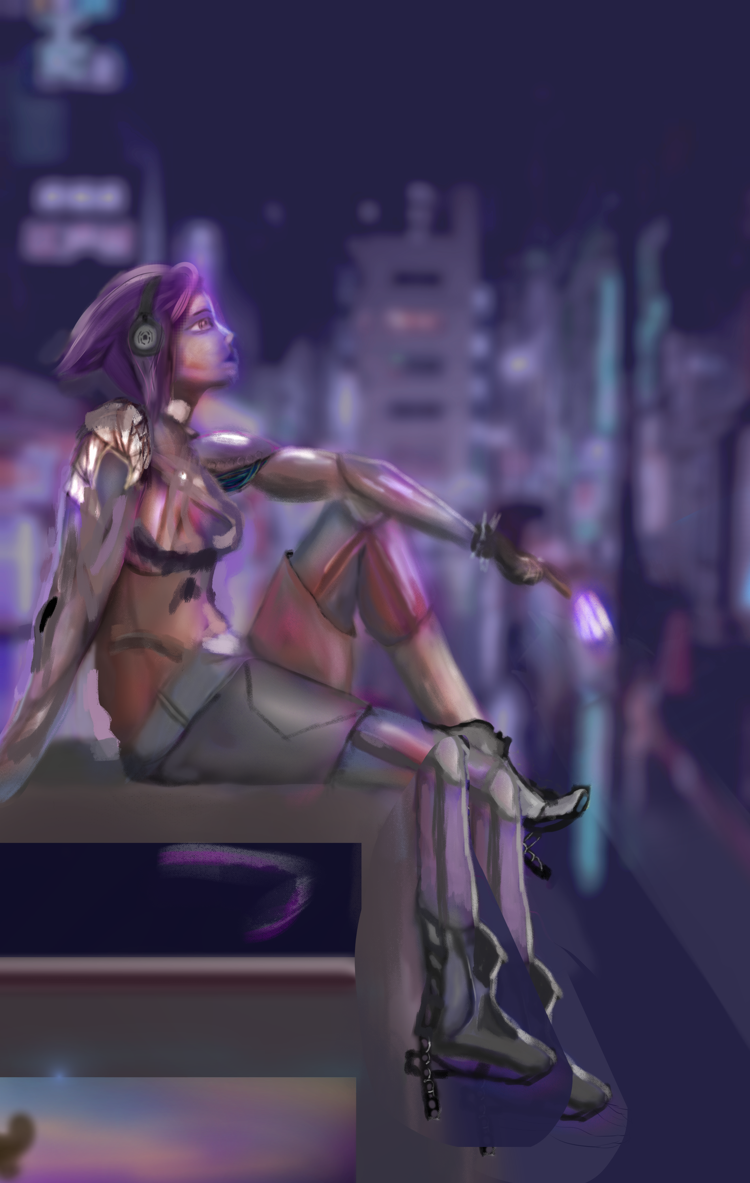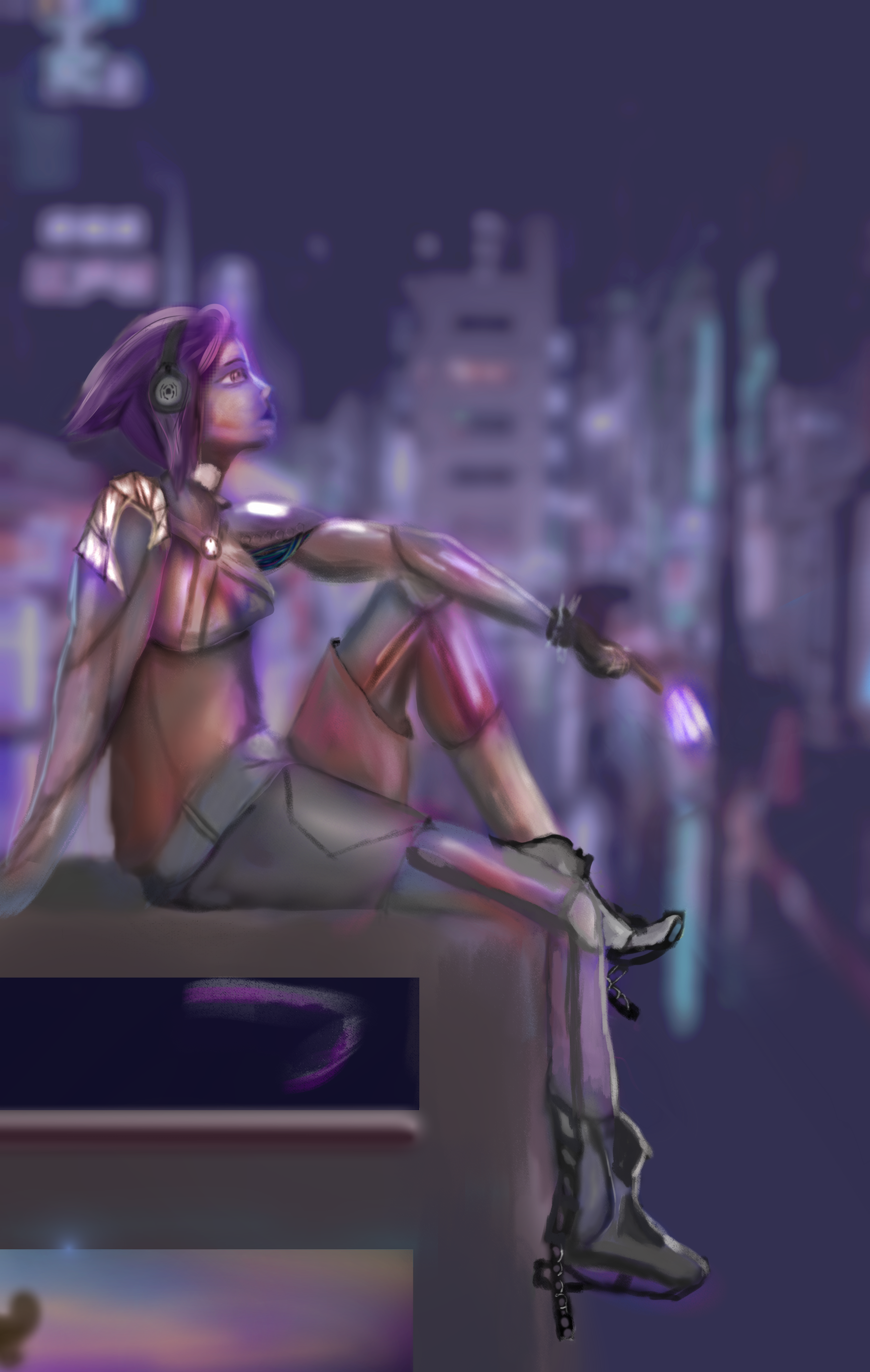 Miasto nocą jest piękne, szczególnie w kolorach różu i fioletu. Narysowanie całości zajęło mi 8 godzin, miałem 2 około pół godzinne może 40 minutowe przerwy. I zamierzam to jeszcze doszlifowywać, generalnie to chciałem namalować coś co będzie zawierało moją oc i będę mógł powiesić na ścianie i umieścić w ewentualnym portfolio. Miałem kilka prac które podobało się mi bardziej niż inne, ale żadnej którą mógłbym nazwać naprawdę dobrą, a w to celowałem z tym.