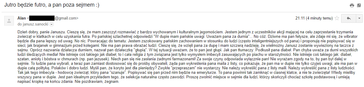 Może w końcu popatrzysz na siebie. Twoje przeklinanie i wyzywanie ludzi od kurw jest dobre i uważasz to za satyrę, ale jak ktoś ci powie - i to bardzo dobrze, bo twój email to brak jakiegokolwiek szacunku (dziwię się, że nie zgłosił cię jeszcze do sądu, a nie dziwię się czemu nie odpowiedział. Nikt na takie coś nie odpowie - może jak twój zakres wiedzy wyjdzie z podstawówki to się przekonasz dlaczego.) - to już jest źle i jak twierdzisz "on jest głupi". Weź dorośnij. Kiedyś ludzie nie mieli nawet czelności pisać do takich osób, a jeszcze takim językiem. A teraz jakiś dzieciak wypisuje bez jakiegokolwiek przemyślenia monologi do posłów. Brak słów.