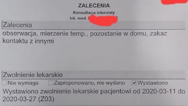 Tak o to obydwoje trafiliśmy na kwarantanne. Zgłoszono nas do sanepidu i mamy siedzieć w domu. Zwolnienie dostałem do 27.03.2020, czyli więcej niż 14 dni.