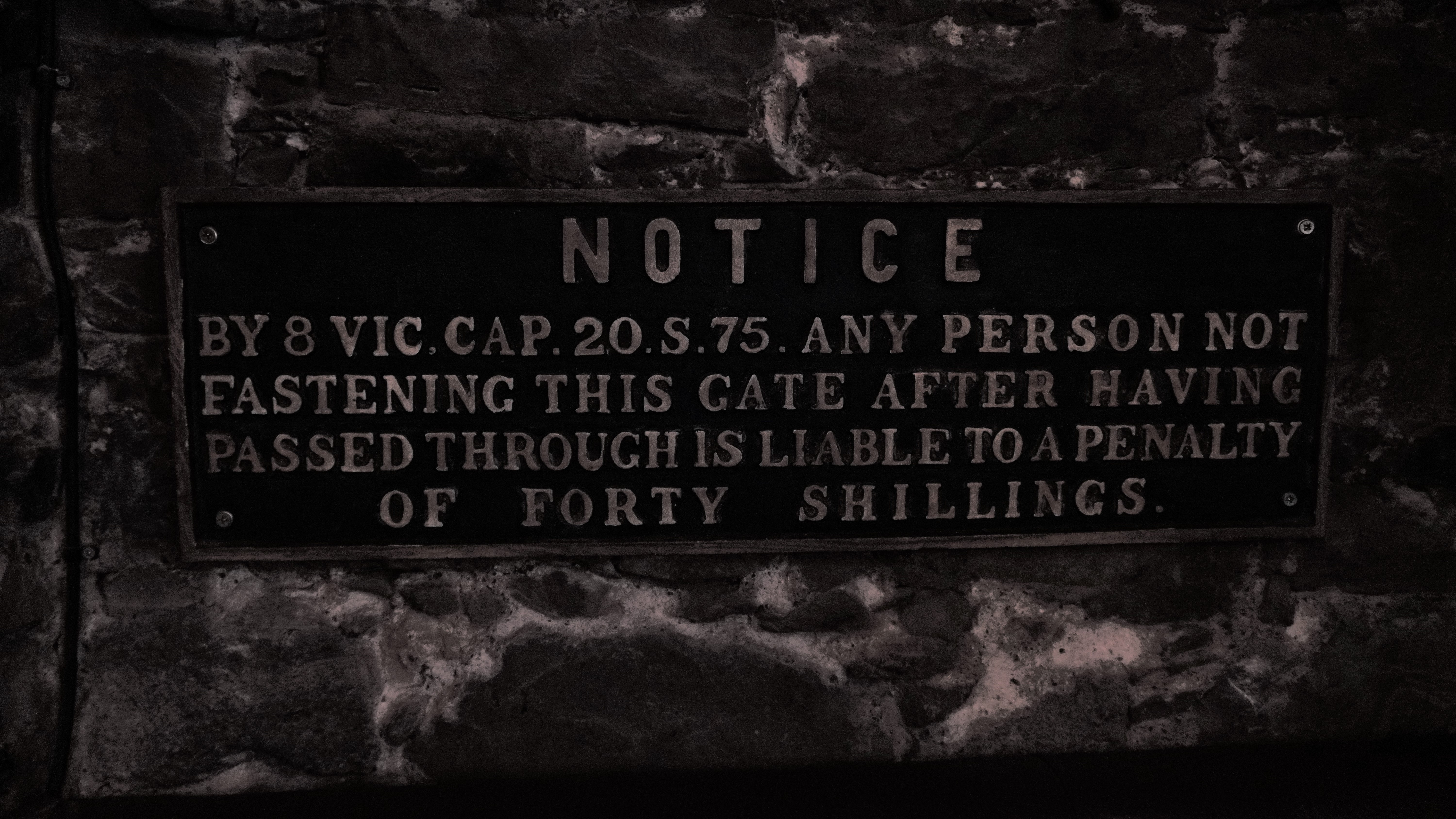 Każda osoba, która nie zamknie tej bramy po przejściu, podlega karze czterdziestu szylingów.