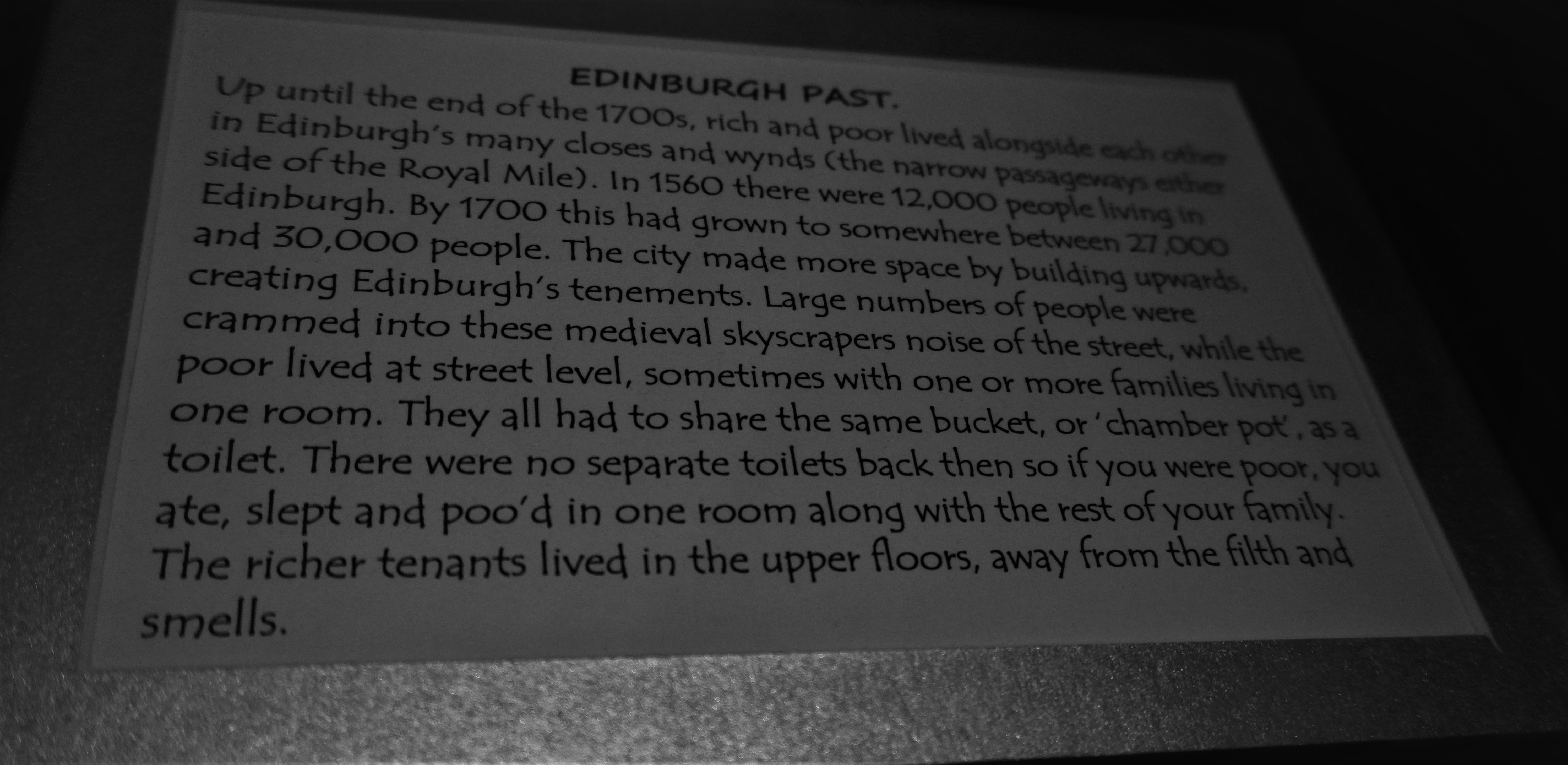 Do końca XVIII wieku bogaci i biedni żyli obok siebie w licznych ciasnych uliczkach po obu stronach Royal Mile. W 1560 r. W Edynburgu mieszkało 12 000 osób. Do 1700 r. Liczba ta wzrosła do 27 000 i 30000 osób. Miasto zrobiło więcej przestrzeni, budując w górę, tworząc kamienice Edynburga. Duża liczba ludzi została wtłoczona w hałas ulicznych średniowiecznych drapaczy chmur, podczas gdy biedni mieszkali na poziomie ulicy. Czasami z jedną lub więcej rodzinami mieszkającymi w jednym pokoju. Wszyscy musieli dzielić to samo wiadro lub komorę z toaletą.