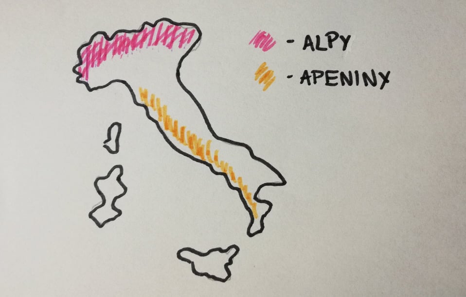 - Na terytorium Włoch znajdują się dwa systemy górskie. Alpy oraz Apeniny. Alpy położone są na północy kraju, Apeniny natomiast ciągną się wzdłuż Półwyspu Apenińskiego.