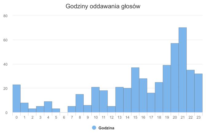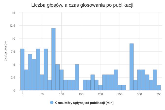 histogram liczby głosów, a czas głosowania po publikacji. Pierwsze 6h od publikacji.