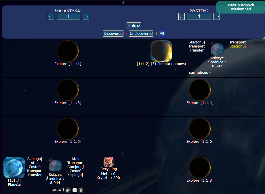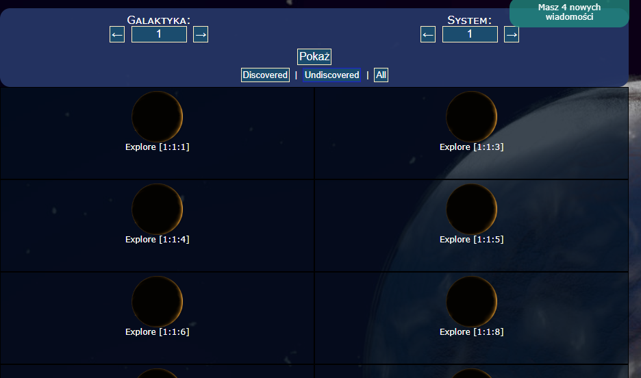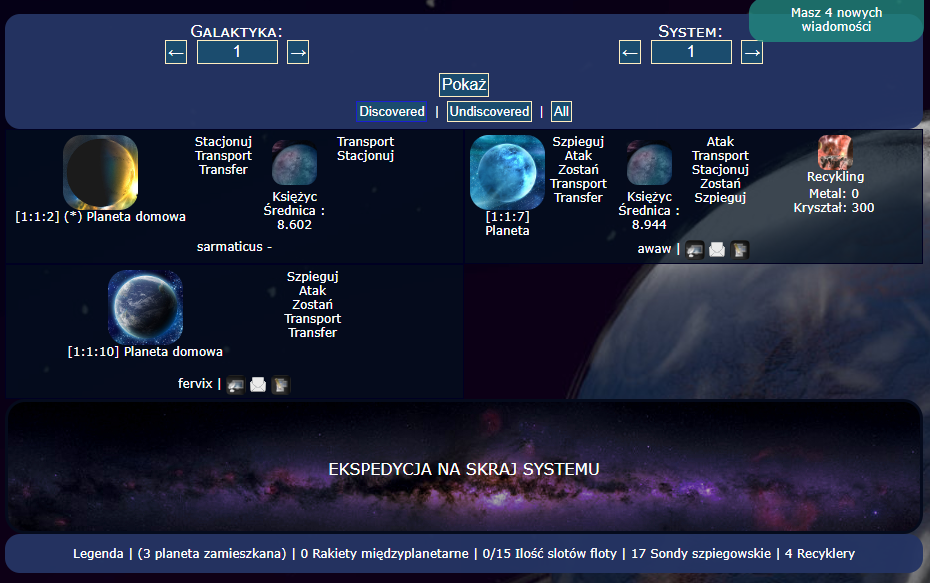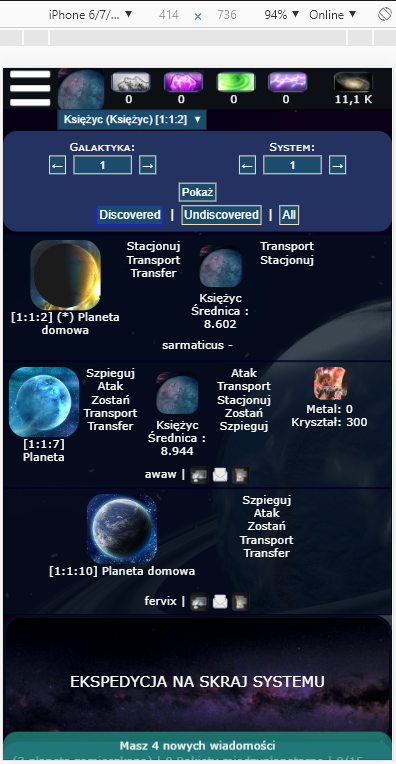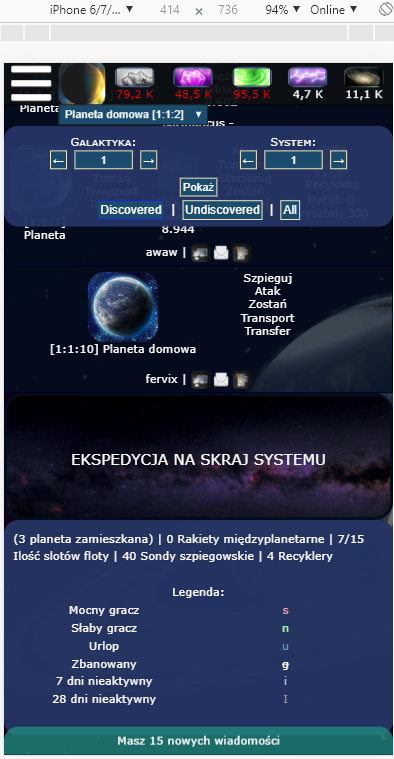 Kilka słów o zmianach i ich powodach. Przede wszystkim stary widok to była nieresponsywna tabelka, która poza tym że wygląda marnie, to przede wszystkim jest bardzo uciążliwa w obsłudze na urządzeniach mobilnych, a nie oszukujmy się komórki to podstawowe narzędzie współczesnego człowieka do korzystania z internetu -> mamy je przy sobie w zasadzie non stop. Główną więc moją myślą było usprawnienie obsługi galaktyki przez smartfony. Przede wszystkim więc zamiast tabelki mamy divy, zamiast wyskakujących tooltipów z misjami czy legendą wszystko jest dostępne od razu. Niestety likwidacja tooltipów powoduje znaczne zużycie miejsca. Wprowadziłem więc dodatkowe "przyciski" które ułatwiają przeglądanie galaktyki, możemy za ich pomocą wybrać czy chcemy widzieć wszystkie pozycje układu, tylko te zamieszkałe czy tylko te nieodkryte. Ponieważ przeglądanie galaktyki służy przede wszystkim do poszukiwania celów i złomu, jako domyślny widok jest ustawiony "tylko zamieszkałe", wydaje się to najbardziej optymalne i wygodne. Poniżej zamieszczam screeny jak to wygląda: