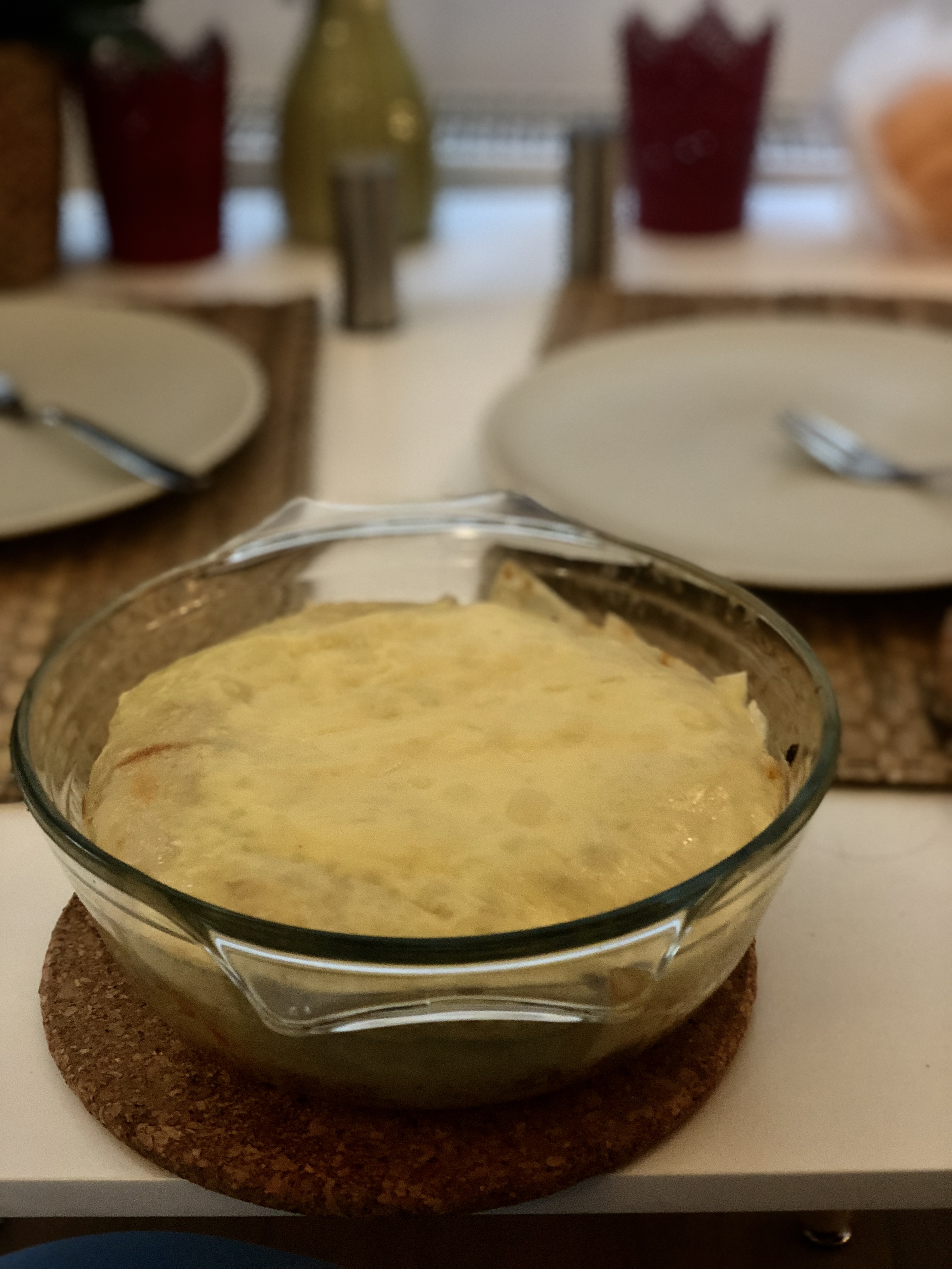 - Układamy naleśniki: jeden na spód bokami do góry, wlewamy beszamel i wkładamy połowę mięsa, układamy kolejny naleśnik, tym razem bokami w dół. Żeby boki weszły lepiej, można docisnąć je delikatnie łyżeczką. Powtarzamy zabieg z beszamelem i mięsem a później nakrywamy ostatnim, 3 naleśnikiem i układamy od razu na górę ser.