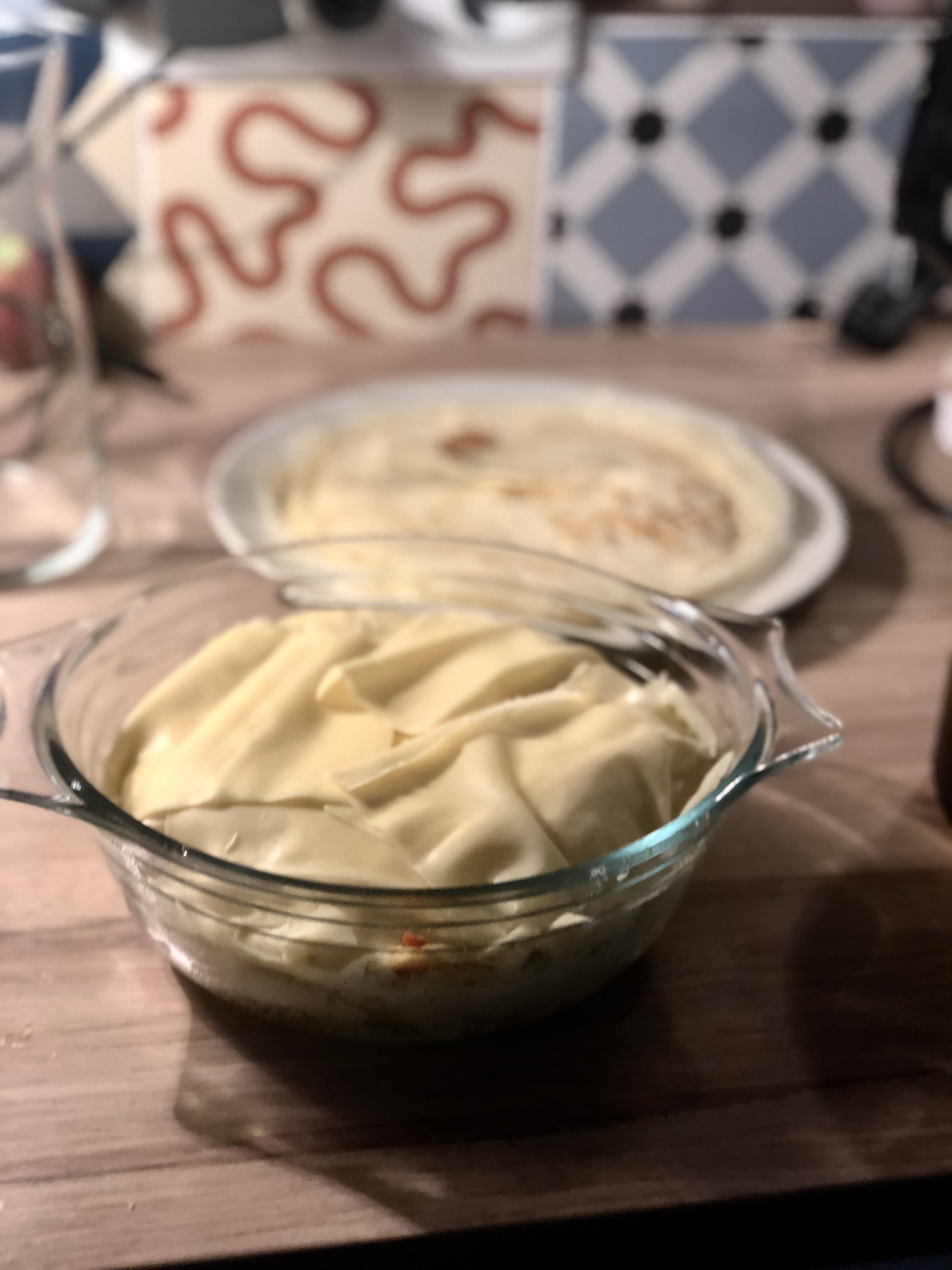 - W międzyczasie robimy beszamel: topimy 2 łyżki masła, dodajemy mąkę szybko mieszając, żeby rozmieszać całość na gładką masę, dodajemy mleko. Doprowadzamy do wrzenia i zdejmujemy z ognia kiedy się zagęści. Dodajemy odrobinę gałki muszkatołowej i soli, gotowe.