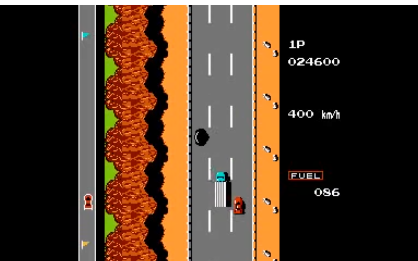 Prędkość maksymalna to 400 km/h. Na dojazd do mety mamy 100 jednostek paliwa (czasu, ale to nie są sekundy!) Głównymi przeszkodami są inne auta, które czasami się odsuwają, a czasami wręcz przeciwnie. Po zderzeniu nasze autko wpada w poślizg i może roztrzaskać się na bandzie, a wtedy tracimy sporo paliwa (czasu).