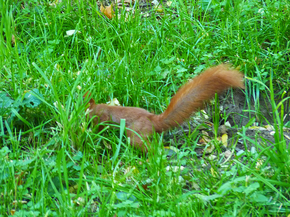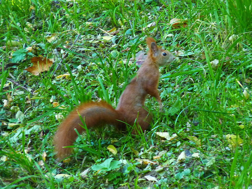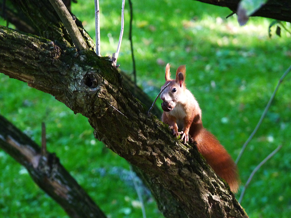 Na szczęście, choć to praktycznie osiedlowy park, wiewiórki wydają się być bezpieczne i szczęśliwe. Widuję je czasem, jak śmigają między zaparkowanymi samochodami i po trawnikach pod blokami. Mieszkańcy reagują przyjaźnie, niektórzy siadają na ławeczkach i dokarmiają "Baśki" orzechami. Wystarczy zastukać w ławkę i już zjawia się jakaś chętna na dodatkowe zapasy na zimę :)