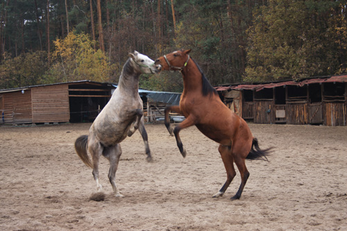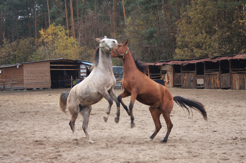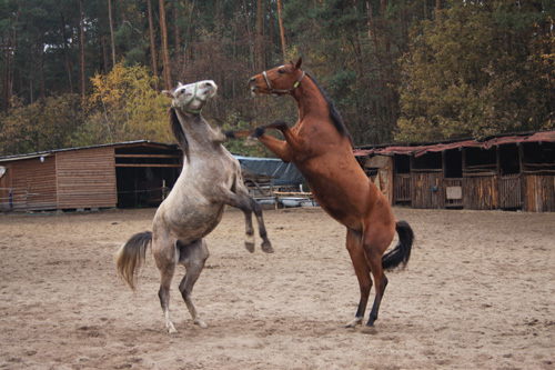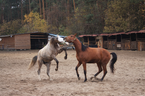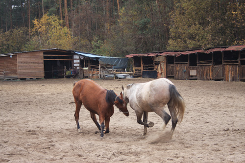 Po śniadaniu w centrum padoku głównym wydarzeniem dnia była próba sił ogierów... Takie męskie sprawy. Siłowa konfrontacja rozstrzygająca sporne kwestie dotyczące hierarchii w stadzie. Wiecie, rozumiecie, dominacja, pożywienie, klacze i te sprawy.