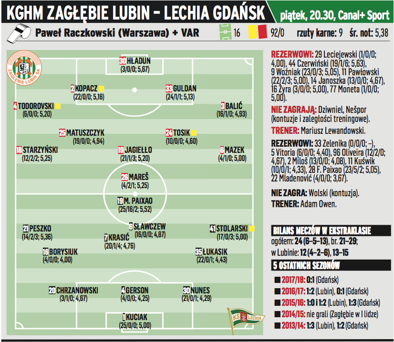 Zagłębię zajmuje 8 miejsce , ostatnie gwarantujące grę w grupie mistrzowskiej. Po słabym początku roku 2018 i tylko 1 punkcie w 3 kolejkach , piłkarze Mariusza Lewandowskiego wygrali z Sandecją 1 do 0. Dziś podejmują u siebie Lechię która nie wygrała w lidze od 7 kolejek i ich szanse na grupę mistrzowską są już tylko matematyczne. Strach pomyśleć gdzie by się znajdowali w tym momencie bez Marco Paixao który ma na swoim koncie 16 bramek w tym sezonie Lotto Ekstraklasy. Trudno mi określić kto to spotkanie wygra więc idę w innym kierunku. Dzisiejsze spotkanie prowadzi Paweł Raczkowski , który rozdaje najwięcej kartek w lidze.