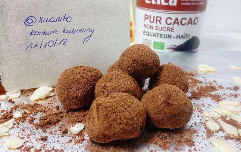 Na moim blogu już od bardzo dawna nie pojawił się żaden słodki przepis więc gdy zobaczyłem jeden z tematów najnowszej edycji konkursu kulinarnego stwierdziłem, że koniecznie muszę spróbować swoich sił. 😊 Moje trufle przyrządziłem w całości z naturalnych składników bez grama białego cukru i innych śmieciowych dodatków. Bazę trufli stanowią rodzynki oraz migdały. Słodycz rodzynek podbiłem dodatkowo stuprocentowym ekologicznym syropem z daktyli, a żeby nie było aż tak słodko, trufle obtoczyłem w gorzkim kakao, tym samym przełamując dominujący słodki smak. Bardzo jestem ciekawy tej konkurencji i nie mogę się doczekać zgłoszeń konkursowych w tej kategorii. Jestem pewien, że wszystkie przepisy będą pyszne i staną się dla mnie ogromną inspiracją :)