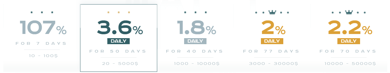 Programik dopiero co wystartował, 29.01.2018 po poludniu. Starannie przygotowany projekt, który posiada licencje na skrypt H. Extended Validation certyfikat SSL od Comodo ważny przez kolejne 271 dni. Dostępne jest 5 planów inwestycyjnych z minimalnym depozytem 10$, przy tym planie dziennie profit to 1%. ROI po 7 dniach to 107%. Przy tym planie zamrażamy kase na 7 dni, po upłynięciu których zostaje nam zwracanie 107%. Kolejny plan 3.6% dziennie przez 50 dni, depozyt jest wliczony w profit, ROI po 50 dniach to 180%. W trzech kolejnych planach od 1.8% do 2.2% dziennie, w zależności od wysokości depozytu, w tych trzech planach depozyt jest zwracany po zakończeniu planu. Płatności poprzez krypto Bitcoin, Ethereum, Dash, Monero oraz PerfectMoney, Payeer, AdvCash, YandexMoney. Generalnie bardzo starannie przygotowany projekt od strony technicznej oraz graficznej oraz dodatkowo bardzo ciekawe niespotykane plany.