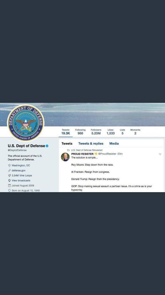 With more than 5 million followers, the U.S. Department of Defense’s official Twitter account retweeted a post that called on the resignation of President Donald Trump over sexual assault allegations