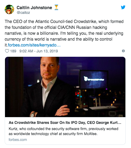 A new article by Forbes reports that the CEO of Crowdstrike, the extremely shady cybersecurity corporation which was foundational in the construction of the official CIA/CNN Russian hacking narrative, is now a billionaire.