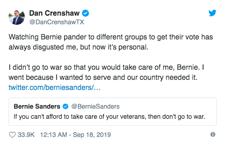 “Watching Bernie pander to different groups to get their vote has always disgusted me, but now it’s personal,” Crenshaw tweeted. “I didn’t go to war so that you would take care of me, Bernie. I went because I wanted to serve and our country needed it.”