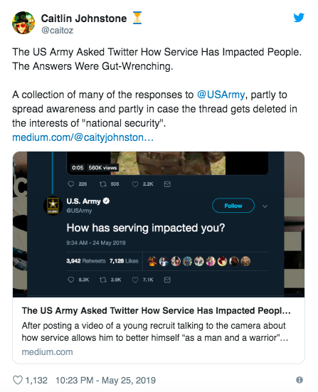 Don't participate in that stupid, war-facilitating, power-serving LARP. Don't say "Thank you for your service" to veterans. Don't pretend to agree with them when they claim to have fought for your freedom and democracy. Openly disagree with people who promulgate this narrative. Treat Veterans Day and Memorial Day as days of grieving and truth-telling, not celebration and glorification. The worshipful propaganda narratives that have been built up around veterans are an important cog in the war machine's consent factory, and they should be attacked as unapologetically as war propaganda narratives about what's going on in Syria or Iran.