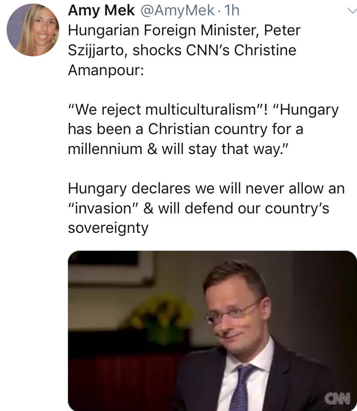 Finally someone had the guts to say it; multiculturalism is bologna. Hungarian Foreign Minister Peter Szijjarto told CNN that his people wish to maintain THEIR culture. The Left is always so hell bent on diluting Western countries (for reasons that are obvious) that they seem shocked whenever a Christian country wishes to maintain its own purity. I have often wondered why it is that multiculturalism is always assumed to be a good thing. I also wonder why it is only a one way street into Western civilizations as well.