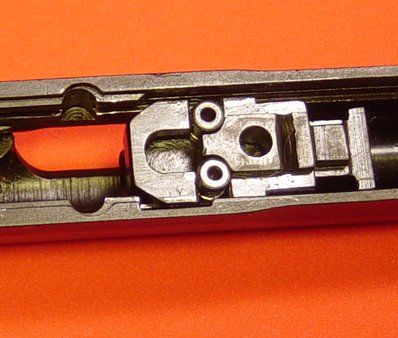 Not only is this symbolic of political defiance in the Warsaw Pact, but this is a masterpiece of design and employs an entirely unique lockup. This single action full steel design feeds from an 8 shot mag and features a unique a short recoil roller locked blowback design that allows for the low bore axis of a straight blowback, but can tame the bark of the Tok. Having a short recoil operated system in this fashion allows for the barrel to move only horizontally, allowing for more accuracy than the Browning style tilting barrel as seen in the 1911 and TT-33. It works by having the full slide and barrel recoil backwards. The rollers in the first image below lock the slide and barrel assembly for a the length of the locking lug. As the assembly moves back, the center lug contacts a block on the frame so that it stays still and the rollers can move along the sides until they can fall into the recesses on the lug and will no longer be captured inside the divots in the slide. This stops the barrel in place and allows the slide to go fully rearwards to recock the hammer and pick up the next round. Once the cycle completes, the recoil spring returns everything to the forward locked position.