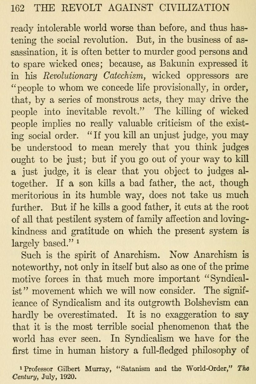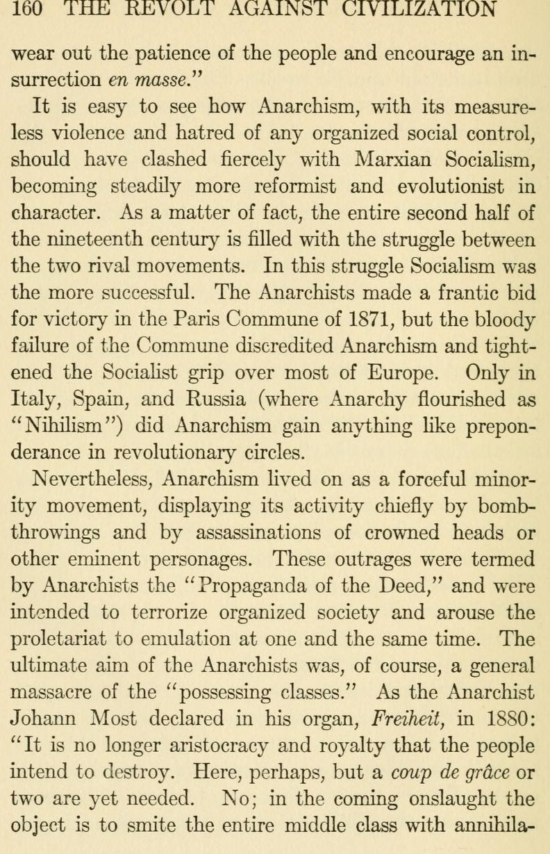 So, if you want to continue to call yourself an anarchist, you may want to re-evaluate that stance in light of these facts put forth by someone that thought anarchism was the under man's revolt against civilization.