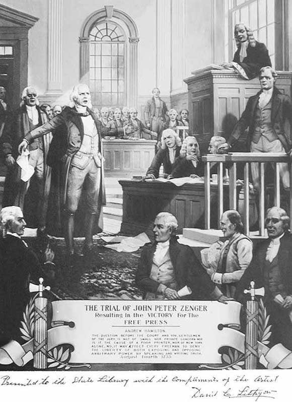 Benjamin Franklin heard about the situation; he wasn’t impressed. So, Ben convinced his buddy, Andrew Hamilton, to represent Pete Zenger. A case of people getting tired of seeing people shAt on you see.? But Ham wasn't living under the today's law or what's left of it.