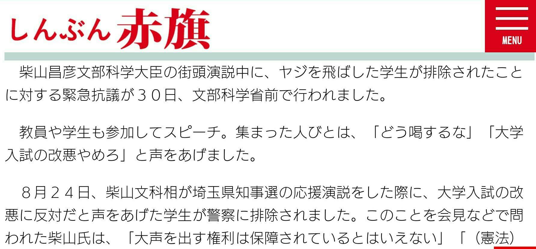 On August 24, when the Minister of Education Shibayama gave a speech to support the governor's election in Saitama Prefecture, students who voiced their opposition to the university entrance examination were rejected by the police. Mr. Shibayama, who was asked about this in interviews, remarked that “the right to speak out is not guaranteed” and “please see Article 13 of the Constitution”.