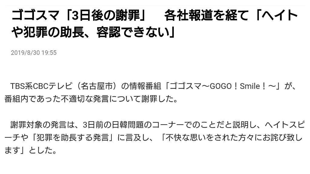 TBS CBC TV (Nagoya City) information program "Gogosuma-GOGO! Smile!-" Apologized for inappropriate remarks in the program.