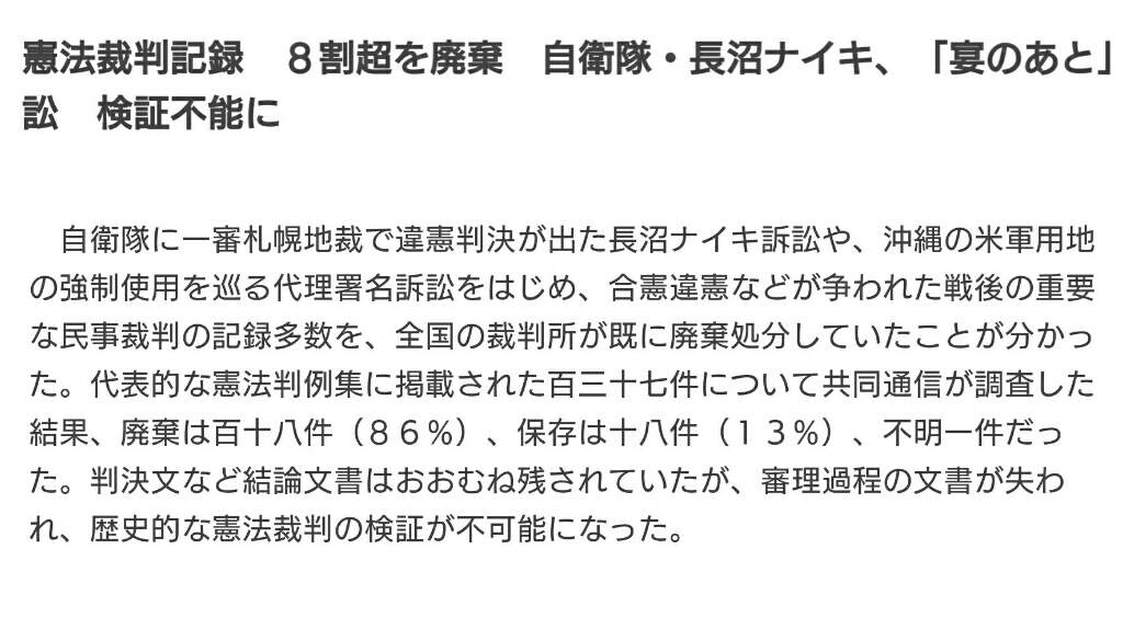 A number of important civil trial records after the war, such as the Naganuma Nike lawsuit that was unconstitutional in the SDF in the first district of the Self-Defense Forces, and the proxy signature lawsuit over the forced use of US military land in Okinawa, It turned out that courts across the country had already been disposed of. As a result of Kyodo News investigating the 133 cases listed in the representative collection of constitutional cases, there were 118 cases (86%) of disposal, 18 cases (13%), and one unknown. Although the conclusion documents such as judgment sentences were mostly left, the documents of the trial process were lost, making it impossible to verify historical constitutional trials.