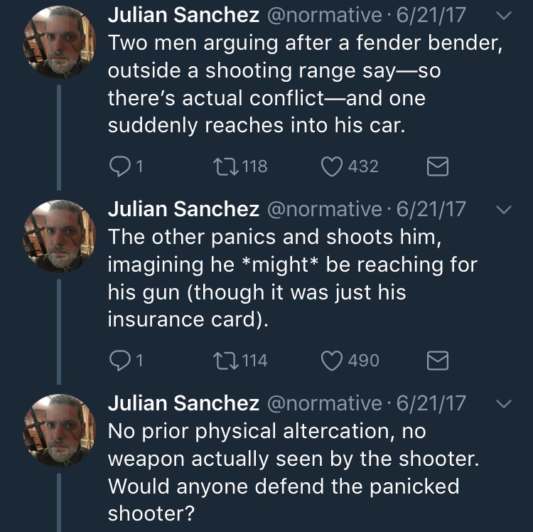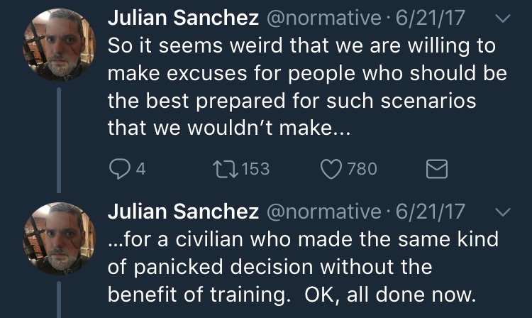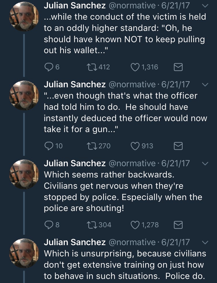 I find this extremely relevant in light of recent discussions about Stephon Clark. All credit goes to Julian Sanchez, who couldn't have said it better.