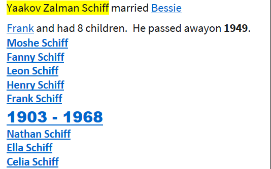 Yaakov Zalman Schiff married Bessie Frank and had 8 children. He passed awayon 1949.