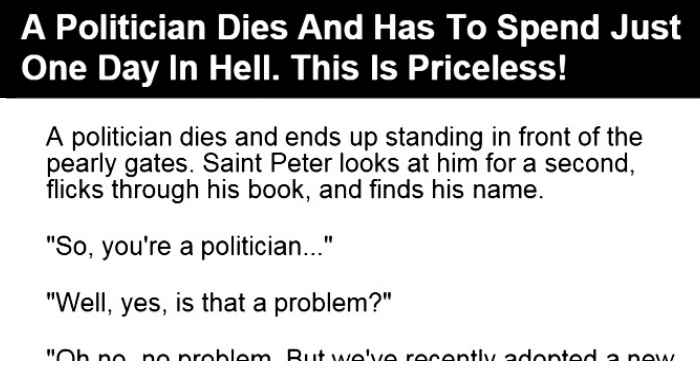 https://www.sunnyskyz.com/funny-jokes/145/A-Politician-Dies-And-Has-To-Spend-Just-ONE-Day-In-Hell-This-Is-Priceless-