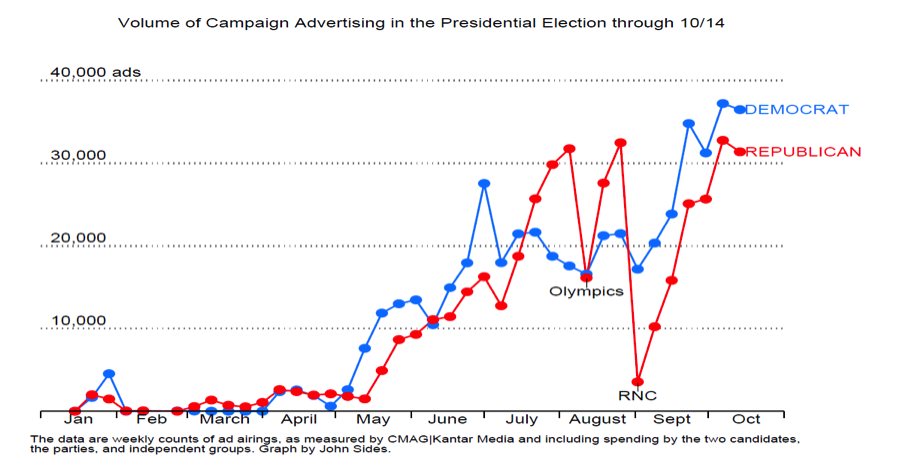 The graph above highlights the increasing amount of advertisements used by political parties as elections approach.