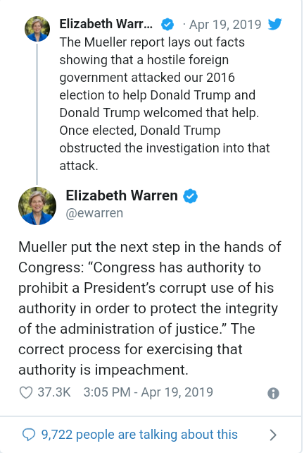 Ever since the Mueller report dropped, Democrats have been talking about impeachment, despite the fact that the report itself found no evidence of any Americans colluding with Russia. So where have the goalposts moved? Obstruction of justice. This past Friday, Senator, and presidential candidate, Elizabeth Warren called upon congress to impeach Trump.