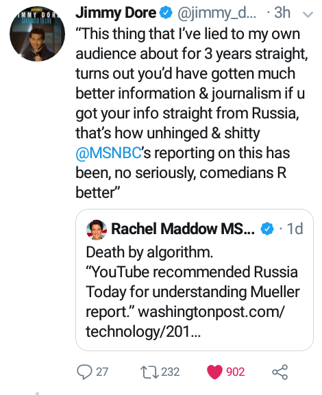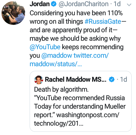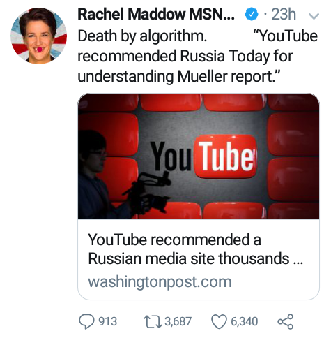 MSNBC host, and top RussiaVape salesperson, Rachel Madcow just Tweeted a Washington Post article about YouTube recommending an RT video to understand the Mueller Report.