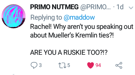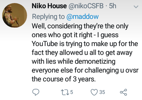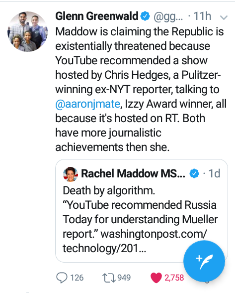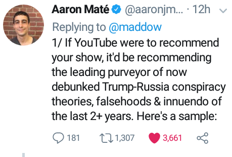 The video the article was referring to was an episode of On Contact with Chris Hedges that featured Izzy Award winning journalist, Aaron Maté. I'll bet you anything Madcow doesn't even know who Chris Hedges is. For those who don't know, Chris is a Pulitzer Prize winning journalist who was fired from NYT because he told the truth about the Iraq War. What I find ironic about this Russia hysteria that's been all over US media is that in the end, RT was proven right. Russian media told more truth on this issue than fuckin MSNBC. Ever since the Mueller report dropped, all the big shot talking heads have been doubling down on their conspiracy theories. In a world where journalistic integrity existed, Madcow and other fuckheads who pushed this conspiracy theory would've been fired. Fuck, they won't even lose their social media pages either.