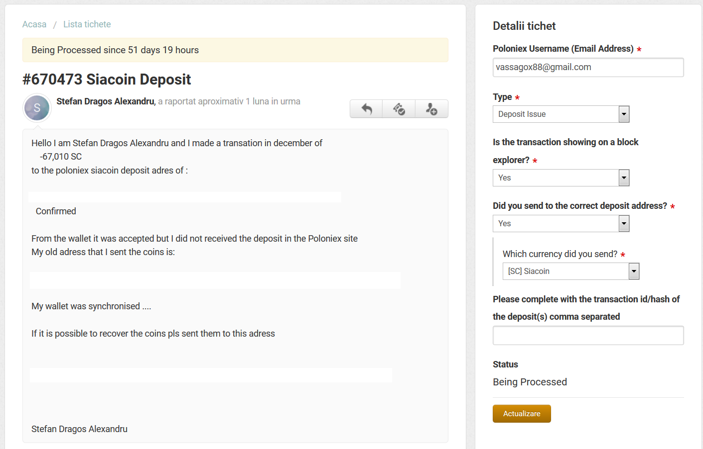 About 51 days ago I made a deposit of over 67000 siacoin on poloniex and I did not received a single anwer until now.