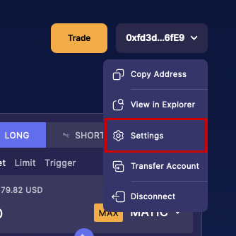 The maximum slippage you accept for a trade can be customized by clicking on your address in the header and on the Settings button accessible from the dropdown menu.