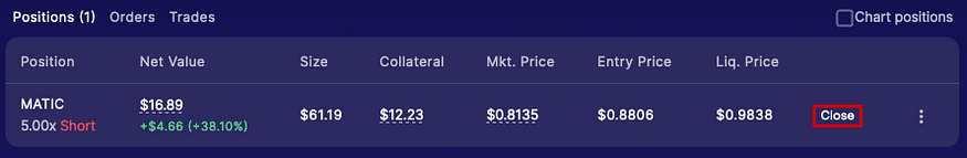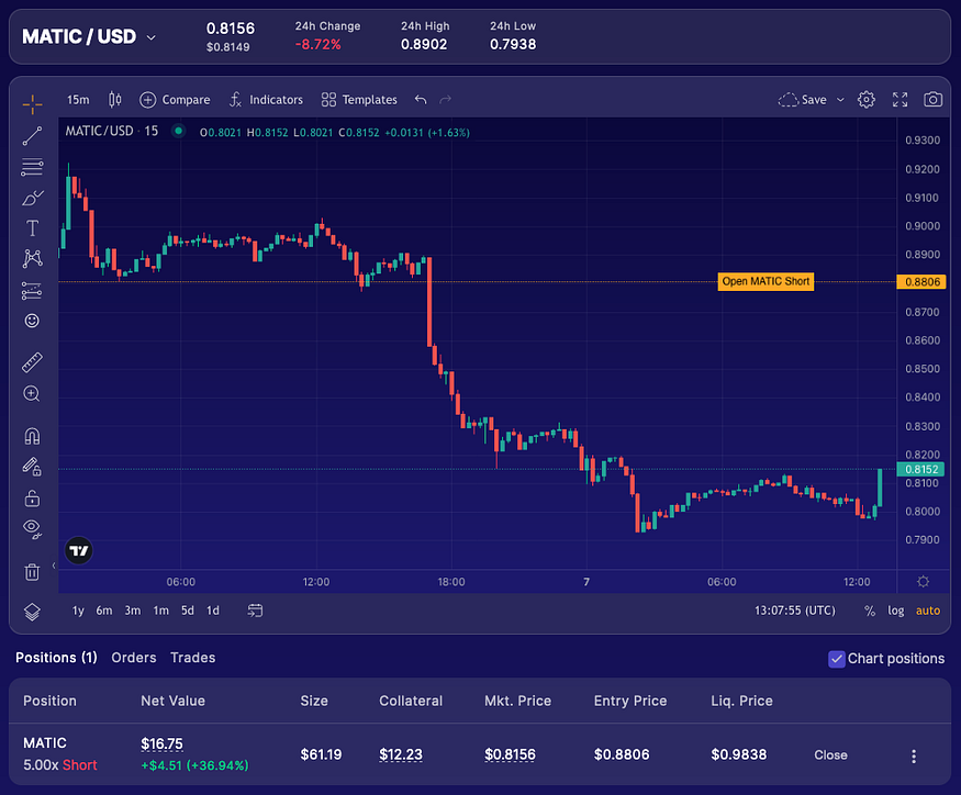 In the example below, we use 100 MATIC to open a Long position on MATIC with a 4.8x leverage.