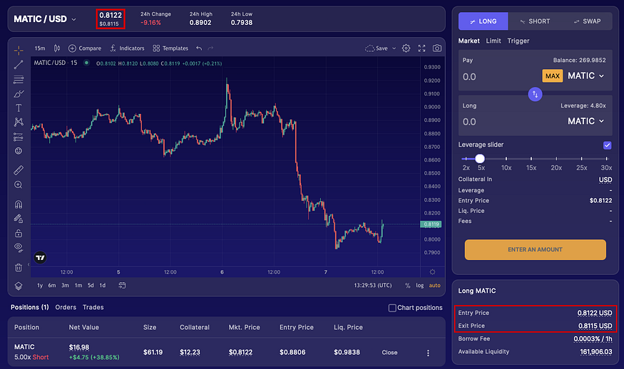 The box below the position box summarizes the trade with: the Entry Price, the Exit Price (which is the price you would get if you were to close the trade immediately after opening it), the Borrow Fee and the available liquidity in the pool.