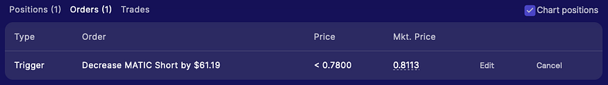 Your newly created trigger order now appears in your position’s row, as well as under the “Orders” tab where you can cancel or edit it, by changing the trigger price if needed.