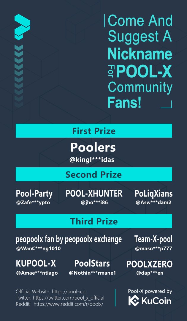 Pool-X Announces Winners For The Guess Pool-X Fans Nickname Twitter Vote.hilee (29)in #poolx • 6 years ago Winner is Poolers! https://twitter.com/pool_x_official/status/1176105501412581376 #kucoin #fansnicknames