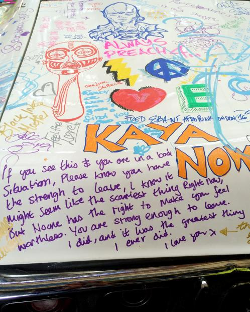 Imogen tells how people are drawn to see what it is all about. “Once I tell my story and what the car represents, men and women open up,” she says. “People then draw and write poems, hopes, dreams, pictures on the body of the Impala. Instead of just another bruised eye or trauma-based image directed at educating the public on violent abuse, I want those who already know how awful and varied abuse is that there is life afterwards.”