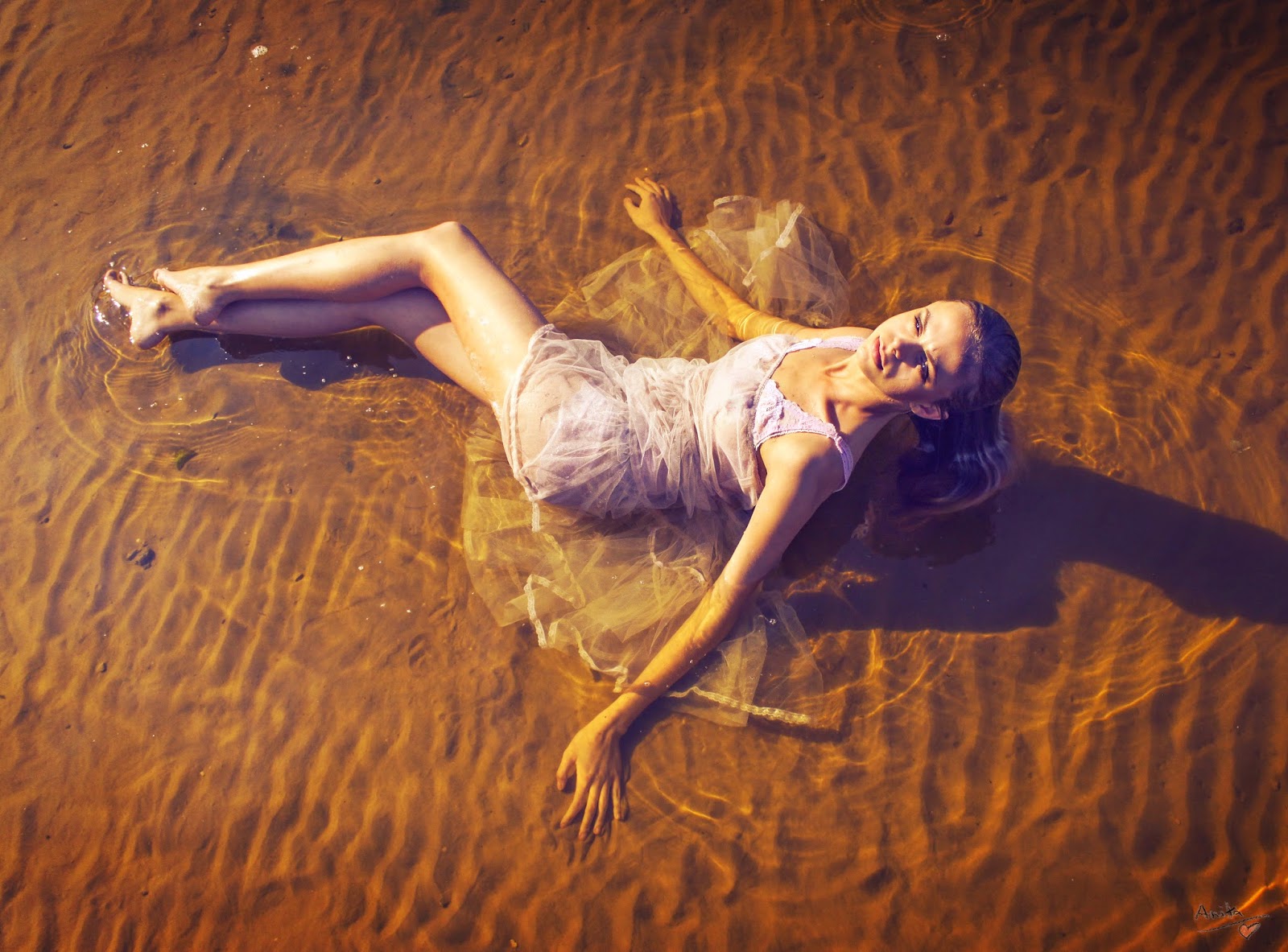 Last but not lest, Love this image with a unique POV from up above during golden hour, but what really set it off for me was how he placed he in the water giving it that fairy tail feeling, with the golden hour lighting casting on the model.